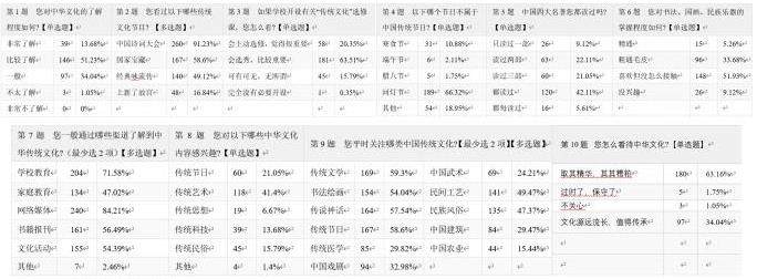 调研显示,近三分之二的学生对中华文化的了解程度较高;一半以上的学生乐意接触中华文化;网络媒体是学生接触传播中华文化的最有力的渠道,学校教育、书籍报刊和文化活动次之;传统艺术是学生最感兴趣的文化内容,分别超过传统节日和传统科技20和28个百分点,一半左右的学生对传统文学、传统节日、传统神话、书法绘画、民间工艺和民族风俗等文化类型表出现较浓厚的兴趣;学生的文化认知水平总体上还有待提高,例如有三分之一的学生对传统节日的了解度不够高,只有不足一半的大学生完整读过四大名著,少量学生几乎没有接触这些经典作品,另有将近2%的大学生否认传统文化的存在价值,超过1%的大学生不关注传统文化。
