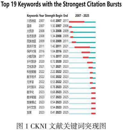 从有关川西地区的研究热点突现图分析,相关研究重点大致历经了生态资源保护、旅游资源开发、数字赋能发展三个阶段。这与国家政策导向一致,数字赋能已成为文旅产业转型发展的重要支撑。从学术研究脉络来看早期数字赋能研究多聚焦于企业运营管理、社会公共服务、产品创新等方面[1],强调数字技术通过“结构赋能”“资源赋能”“心理赋能”三维机制提升组织效能[2]。然而,文旅产业的特殊性在于其高度依赖文化基因与实地体验,单纯的技术移植可能引发“水土不服”。吕普生(2020)指出,当前文旅数字化研究仍停留在技术工具应用层面,缺乏对文化价值转化机制的深度探讨[3]。与此同时,乡村振兴研究虽已关注到数字经济的基础设施建设[4],但对文旅产业这一支柱领域的数字化转型路径研究明显滞后。这种理论与实践的脱节,导致现有政策在川西民族地区落地时面临“最后一公里”难题:一方面,政府主导的数字化项目因脱离本土文化语境而收效甚微;另一方面,市场主体因缺乏技术能力与创新动力,难以突破传统观光模式的路径依赖[5]。