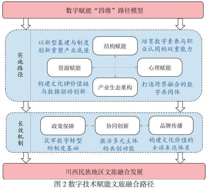 川西民族地区文旅产业的数字化转型,需以系统性思维破解结构性矛盾,通过“结构—资源—心理—生态”四维赋能路径实现全链条升级。这一过程既要依托技术工具突破物理边界,更需构建与民族文化特性适配的价值创造体系。图2展现了本文构建的数字赋能文旅融合发展的具体路径。