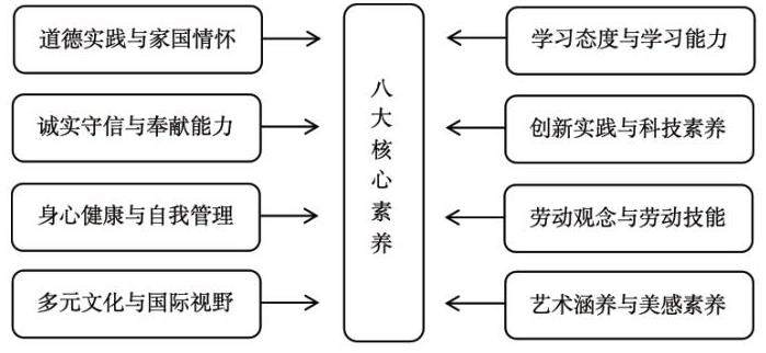 核心素养指标的确定是构建大学生综合素质评价体系的关键环节。本研究基于学生在校期间参与思想政治教育活动、专业学习活动、文化体育活动、社会实践活动以及创新创业活动等多方面的行为表现,确定了八大核心素养指标,具体包括:道德实践与家国情怀、诚实守信与奉献精神、身心健康与自我管理、多元文化与国际视野、学习态度与学习能力、创新实践与科技素养、劳动观念与劳动技能、艺术涵养与美感素养。这些指标涵盖德智体美劳多个维度,全面反映了学生综合素质的核心要素。道德实践与家国情怀强调学生的社会责任感和文化认同;诚实守信与奉献精神突出学生的诚信意识和社会责任感;身心健康与自我管理关注学生的身体和心理健康,培养其自我管理能力;多元文化与国际视野提升学生的跨文化交流能力和全球视野;学习态度与学习能力注重学生的学习习惯和方法;创新实践与科技素养鼓励学生的创新能力和科技应用能力;劳动观念与劳动技能培养学生的基本劳动技能和职业素养;艺术涵养与美感素养提升学生的审美能力和艺术修养。这些核心素养指标共同构成了学生全面发展的核心框架,旨在培养具有社会责任感、创新精神和实践能力的高素质人才。具体如下图所示: