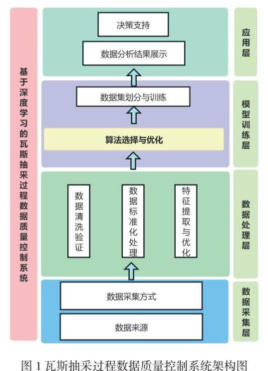 瓦斯抽采过程数据质量控制系统的整体架构,底层算法处理模型基于深度学习算法,主要由数据采集层、数据处理层、模型训练层、应用层等组成。