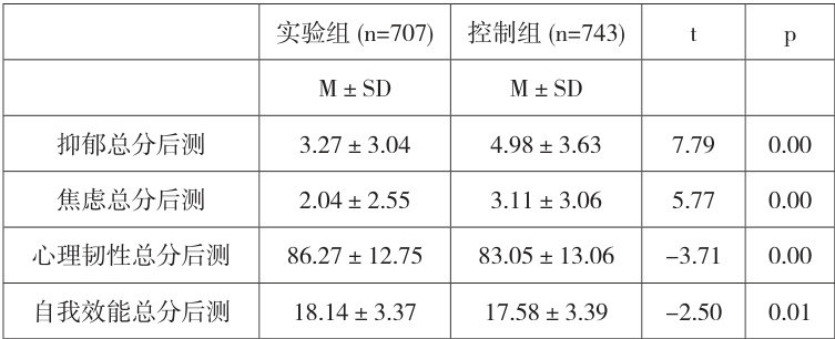 通过对实验组与对照组进行独立样本 t 检验,由表 2 可知,通过使用游戏教学法与传统教学两种不同的方法,大学生在心理健康(抑郁和焦虑)与心理素质(自我效能感和心理韧性)上存在显著性差异( p<0.05 ),在心理健康(抑郁和焦虑)上均是实验组低于控制组,而在心理素质(自我效能感和心理韧性)上,均是实验组显著高于控制组。