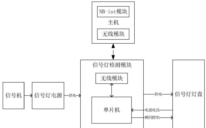 信号灯检测模块安装于信号灯电源与灯盘之间,内置微控制器(MCU),实时采集灯盘工作电流和电压数据,具备本地异常状态初步判定功能(如过流、欠压检测),并通过无线通信与主机交互;该模块同时支持接收主机指令控制灯盘频闪,便于现场故障定位。
