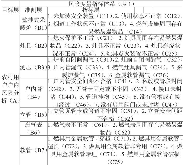 在对农村气代煤工程用户户内风险因素进行识别,以农村用户户内风险度量分析作为目标层(A),以壁挂式采暖炉、灶具、测压、户内管、立管、燃气表、软管为准则层(B1,B2,B3,B4,B5,B6,B7),以上设备相关风险作为指标层(C1N,C2N…C7N),建立风险度量指标体系,如表1 所示。