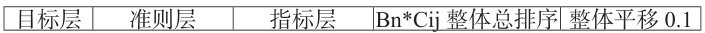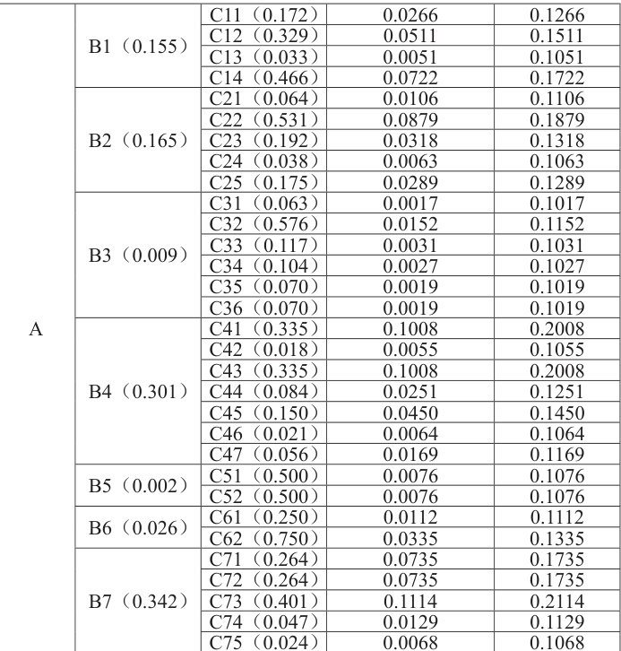 通过计算准则层(BN)、指标层(Cij) 上各因素与上一层因素的相对权重,可综合得出指标层各因素对目标层的相对权重,然后进行整体总排序,见下表。