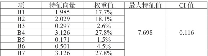 最大特征值 λmax 为 7.698,由检验公式及表 3 计算得 CR 为 0.088<0.1 ,一致性检验通过。