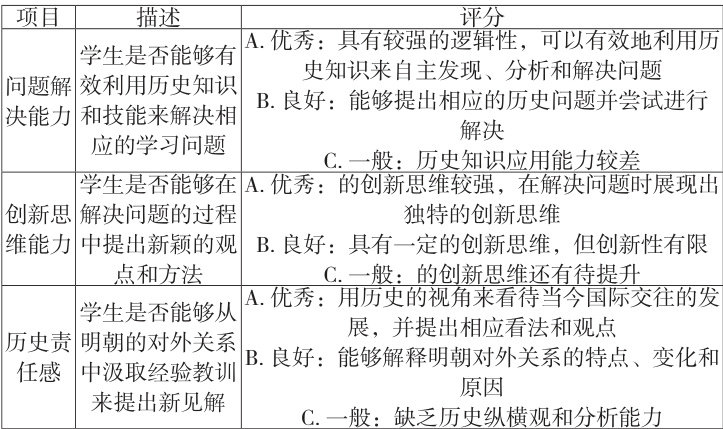 教师在完善教学评级体系时,可以从过程性评价和结果性评价两方面来关注和评估学生在初中历史教学课堂上的表现情况,并及时反馈学生的学习水平,以适当调整教学策略和方法。例如,在进行《明朝的对外关系》这一课教学时,教师可以在课堂上按照教学内容来设计一些具有探究性和启发性的问题和学习任务,注重引导学生自主探究和学习,如“你认为明朝的对外关系在当时和如今分别有什么历史意义?明朝是如何处理与周边国家的军事关系和边防安全的?明朝在与外国进行贸易和文化交流时,引进了哪些文化和技术?对中国社会和文化的发展有什么样的影响?”以及“戚继光抗倭体现了什么样的精神?”等。同时,还可以设计“阅读与明朝对外关系有关的史料,并能够结合历史实际来说出明朝与其他国家交往中所采取的方法。”