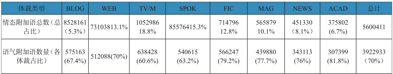 由 表 3.1 中 的 数 据 可 以 看 出,TV/Movie、BLOG、SPOKEN三种体裁为情态附加语使用最多的领域,占总频数的约 50% ;ACADEMIC(学术体裁)使用频率最低,仅占 6.7% 。各体裁中语气附加语使用比例均高于评论附加语,如 ACADEMIC 中语气附加语占比达 81.8% 。