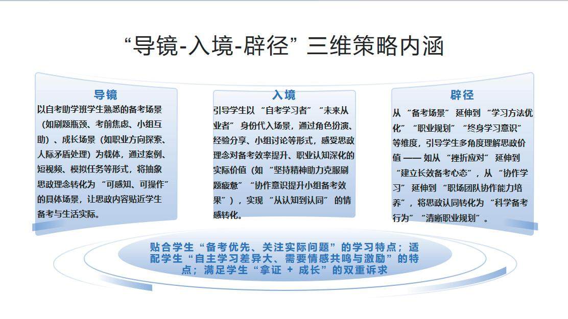 摘要:高校继续教育自考全日制助学班学生以“自考备考拿证”为核心目标,存在自主学习能力差异大、备考压力集中、职业规划模糊等特点,传统思政教育面临内容与备考需求脱节、形式与学习节奏错位、评价与成长转化割裂的困境。本文创新提出“导镜·入境·辟径”思政教育框架,以“自考备考场景思政互动剧”为载体,将思政理念嵌入刷题瓶颈、考前焦虑、小组互助等备考场景,实现“思政育心”与“备考赋能”双重目标,为自考助学班思政教育提供实践路径。