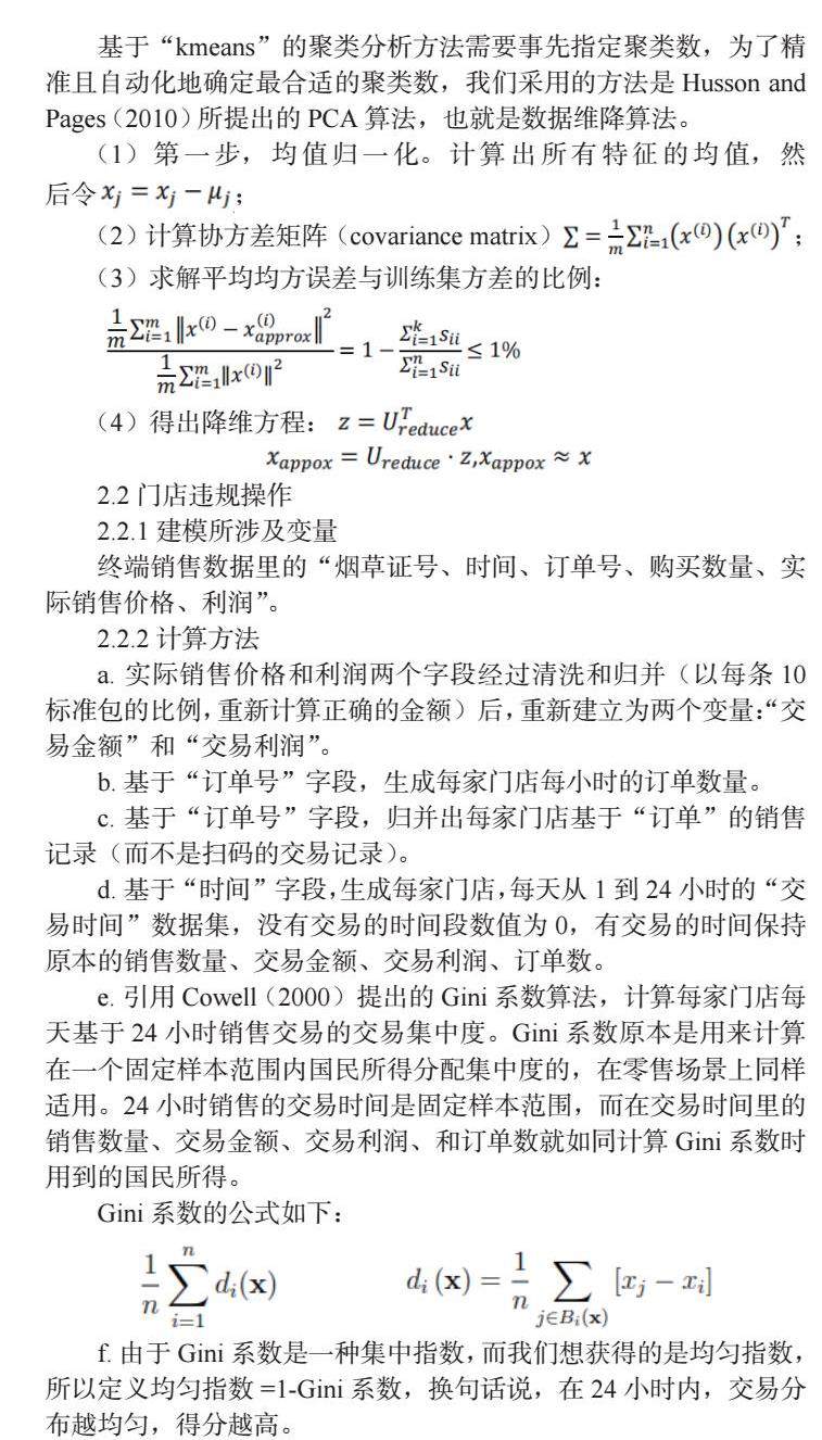 h. 依据前述计算出来的销售数量、交易金额、交易利润、订单数均匀度分布,以及g所计算出来的“合理交易密度”得分,采用和前述2.1.2相同的基于kmean和PCA的聚类分析方法,对所有数字门店进行潜在“违规操作”的聚类分析,得到“合规指数”,数值越高代表门店的运营管理越合规,并据此对门店样本进行分群。