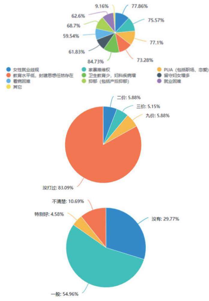 社会生存环境可以从侧面反映出妇女群体所面临的生存压力和困境。数据显示,妇女群体所处的社会环境的消极方面的形式较为复杂,涉及到各个领域、各个方面,包括女性职场上的歧视和就业难题占77.86%;就医用医困难程度较高,妇科疾病的增加占84.73%;受教育水平过低,农村乡镇地区的封建思想固化,留守妇女较多,有关卫生方面的知识有所欠缺;妇女群体在心理健康方面的问题也具有复杂性,如PUA、抑郁症等等;以及在家庭环境下受到家暴的问题。种种问题皆在社会总问题中占有极高的比例,妇女群体的社会环境问题亟需改善。