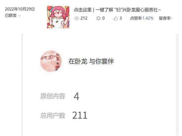 为创新“妇”兴卧龙爱心服务社新模式,实时播报发展动态,为此创建“在卧龙,与你襄伴”公众号,面向卧龙镇妇女以及更广的妇女群体,为传播相关知识提供了更加便捷高效的通道。该公众号运营内容、用户数与点击量如下图所示: