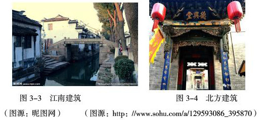 不同地区的建筑色彩也区别明显。在江南一带,建筑多为黑白灰,白墙黑瓦的设计(图3-3),让建筑与周围景色融为一体,让人在湿热的南方保持平静的心情。而北方则大有不同,建筑色彩多为浓烈的红色、黄色、蓝色(图3-4),视觉冲击力强,以驱散冬天的寒冷。还有以“红砖白石”为特点的闽南民居,以褐色为主的吊脚楼建筑等等。