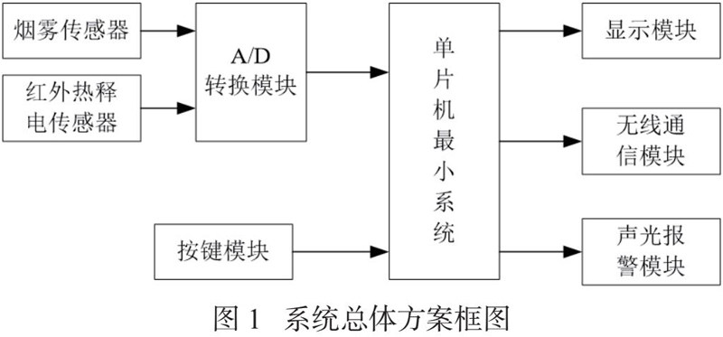 系统的总体方案设计框图如图1所示。本系统主要由STC89C52单片机、红外热释电传感器、烟雾传感器、A/D转换模块、显示模块、无线通信模块、按键模块、声光报警模块等组成。