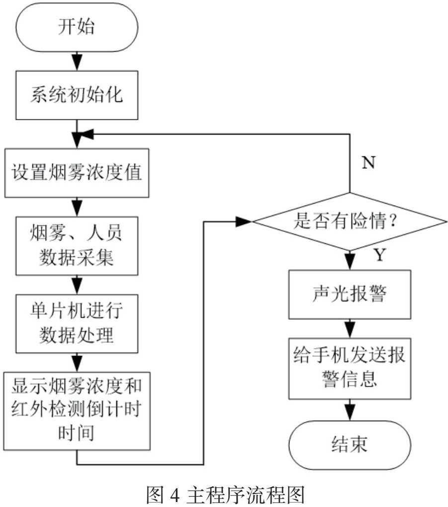 本设计的主程序流程如图4所示。首先进行系统初始化,然后传感器进行烟雾等数据采集,送到单片机进行数据处理和分析,判断是否有危险事件发生,当烟雾浓度超过阈值或有人闯入时,即发生了危险事件,启动声光报警,同时通过SIM800L向用户手机发送短信,告知用户危险事件的发生,实现远程预警。