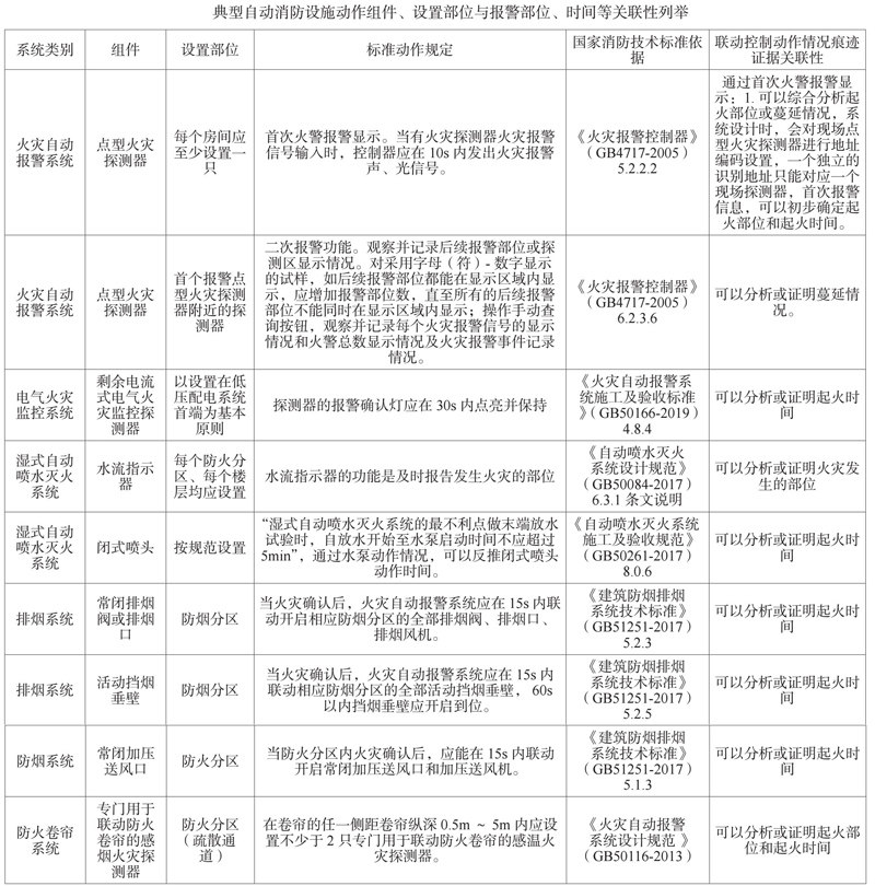 所谓自动消防设施联动控制动作情况,是指当发生火灾时,因受火灾烟、温、光等直接或间接作用,建筑内集中报警控制器和与之相连的火灾自动报警系统、自动喷水灭火系统、防排烟系统、气体灭火系统等系统或组件会有相应动作,其相应动作情况会在集中火灾报警控制器和图形显示装置反馈和显示。自动消防设施(如点型感烟探测器、点型感温探测器、水流指示器、流量开关、压力开关、低压压力开关、排烟阀、活动挡烟垂壁、排烟窗等)联动控制动作情况,证明起火时间和起火部位等存在对应关系,与火灾原因认定的相关证据具有重合性、充分性,在确定起火时间和起火部位时,具有因果和逻辑关联性,相应的痕迹证据既可以作为证据使用,也可以为火灾现场勘验提供线索和帮助。