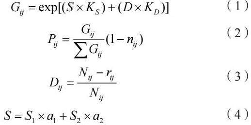 在利用多场域元胞自动机模型进行模拟时,要充分考虑到在拥挤条件下人员的体型特点,除此之外每个元胞中最多只能包含一个行人。总场域模型为(1);行人以元胞ij为目标的转移概率模型为(2);元胞ij及邻域元胞密度定义模型为(3);S静态场到出口的距离和固定边界为(4)[2]。