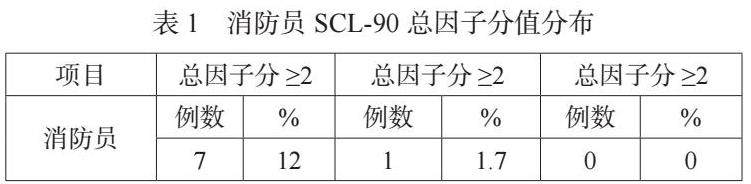 根据SCL-90调查问卷统计结果,被调查人员中无总因子分≥3者(即心理异常者),这表明消防员的心理健康状况总体上是很好的,没有出现心理异常症状者。总因子分≥2者共有7人,占总数12% , 这表明消防员中有部分人员存在一定程度上的心理问题,如表1所示。