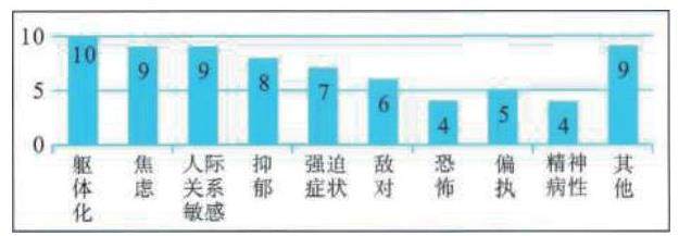 根据统计数据可知(见图1),“躯体化”中阳性因子数为10,“焦虑”中阳性因子数为9,“人际关系敏感”中阳性因子数为9,“抑郁”中阳性因子数为8, “强迫症状”中阳性因子数为7, “敌对”中阳性因子数为6, “恐怖”中阳性因子数为4,“偏执”中阳性因子数为5,“精神病性”中阳性因子数为4,“其他”中阳性因子数为9。其中阳性因子由多到少居前5的 分别是“躯体化” “人际关系敏感”“焦虑”“其他”和 “抑郁”,表明消防员在这5方面可能存在心理健康问题。