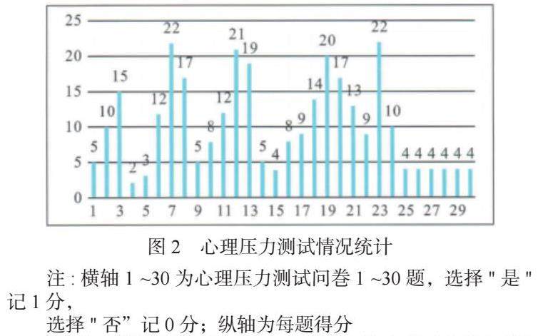 国家队及专职队消防员累计60余名同志参与心理压力测试统计,在30道心理压力测试题中,被调査人员存在问题的频数如图2所示。其中频数居前5的问题项分 别为:“背部和腰部经常疼痛” “早上经常有起不来 倦怠感”“眼睛很容易疲劳””睡眠不好”“有鼻阻、鼻塞现象”,表明这5种现象是消防员心理压力最主要的表现形式。