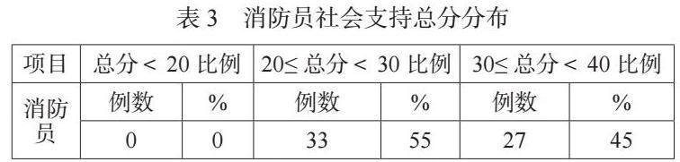 社会支持总分就是十个题目得分的总和。总分 <20分,为获得的社会支持比较少;总分>20分,即为正常情况,其中总分20 -30分,为具有一般社会支持,总分30 -40分,为具有满意社会支持。60名消防员社会支持的总分分布如表4。所有被调查消防员都能获得基础的社会支持,其中55%的消防员只能获得一般社会支持,45%的消防员能获得满意社会支持。