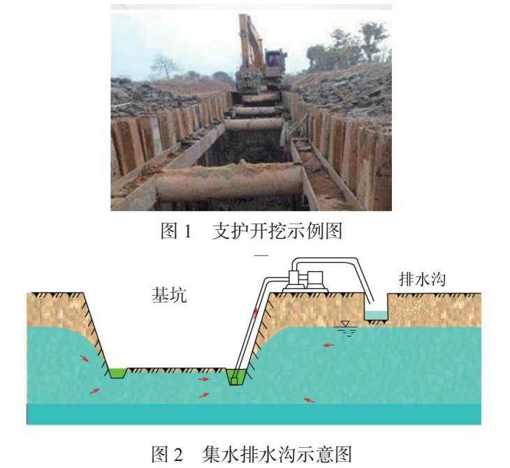工程中,由于地下水水位较高,为防止槽底地下水突涌,保持施工界面干燥,施工单位在槽底开挖排水沟,排水沟深度1.0~1.5m,排水沟中渗水由抽水泵抽出至沟槽外(如图2所示),排入沟槽外排水沟内,径流至河道或市政雨污水管网。