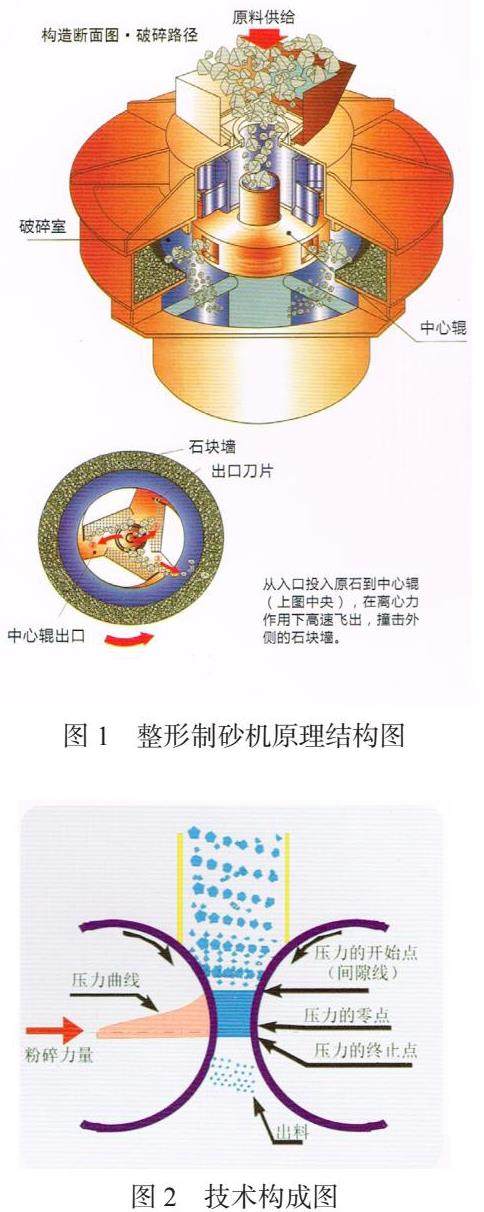 整形制砂机通过高速转运的转子磨辊产生离心力,使进入转盘的原料颗粒产生挤压自磨,并使原料颗粒产生极大的动能储备。原料颗粒在抛出刀口后具备极大的动能和线速度(35-65m/s),进入破碎室中原料颗粒之间相互撞击或撞击破碎室内侧的碎石石墙(技术原理如图2)。