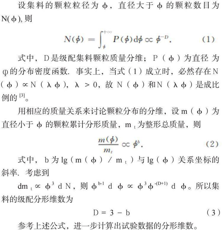 式中,D是级配集料颗粒质量分维;P(φ)为直径 为的分布密度函数.事实上,当式(1)成立时,必然存在N(φ)∝N(λφ),λ>0,故 N(φ)和N(λφ)是成比例的[3]。