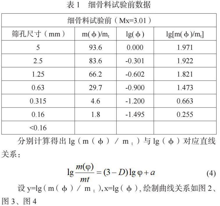 细骨料级配数值可形成一种分布函数,这种分布函数就是一种分形,根据国内学者汪振双、王立久对混凝土细集料级配分形试验研[2]究中引用数学计算公式进行计算,计算如下: