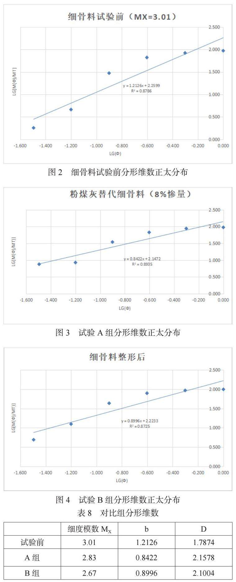 2)通过分形维数的分析,8%粉煤灰替换砂与机制整形砂对比,细度模数与分形维数呈现正相关关系,0.16mm含量及1.25~2.5mm颗粒含量的影响与分形维数呈现负相关关系。