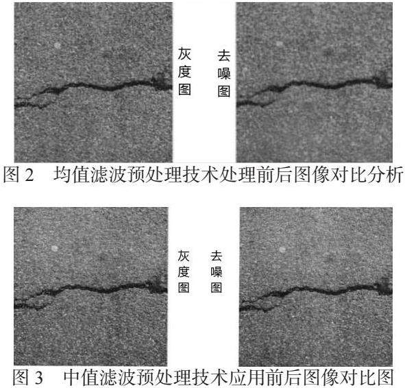 上述公式中g(x,y)表示预处理后图像;f(x,y)表示原始图像;W表示裂纹模型二维模版。此技术实际应用期间多以奇数像素数有序排列方式为标准,随即根据中间值确定新数据,如(图3)所示,明显图像边缘清晰度略高于上述提到的均值滤波预处理图像,针对沥青路面裂纹检测活动,可以首推中值滤波预处理技术,进一步提升图像反馈真实度和清晰度,作为数字图像处理技术的前期基础,值得引起检测人员的重视。