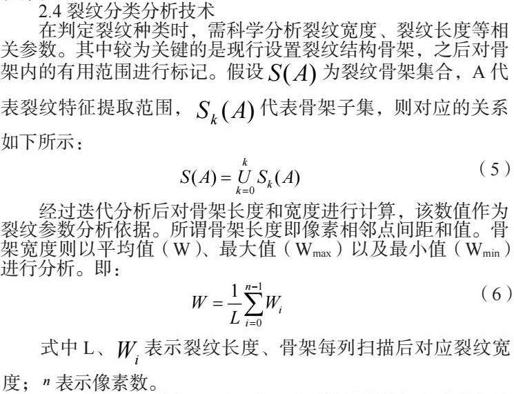 在判定裂纹种类时,需科学分析裂纹宽度、裂纹长度等相关参数。其中较为关键的是现行设置裂纹结构骨架,之后对骨架内的有用范围进行标记。假设为裂纹骨架集合,A代表裂纹特征提取范围,代表骨架子集,则对应的关系如下所示: