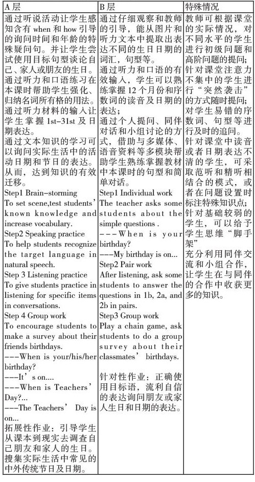 从英语学科的特点出发,英语课堂的分层作业具有可操作性和多样性。从学生的实际出发,英语课堂的分层作业更有利于发挥学生课堂主体地位的作用。以(人教版)初中七年级英语(上册)Unit8 When is your birthday?为教学案例。