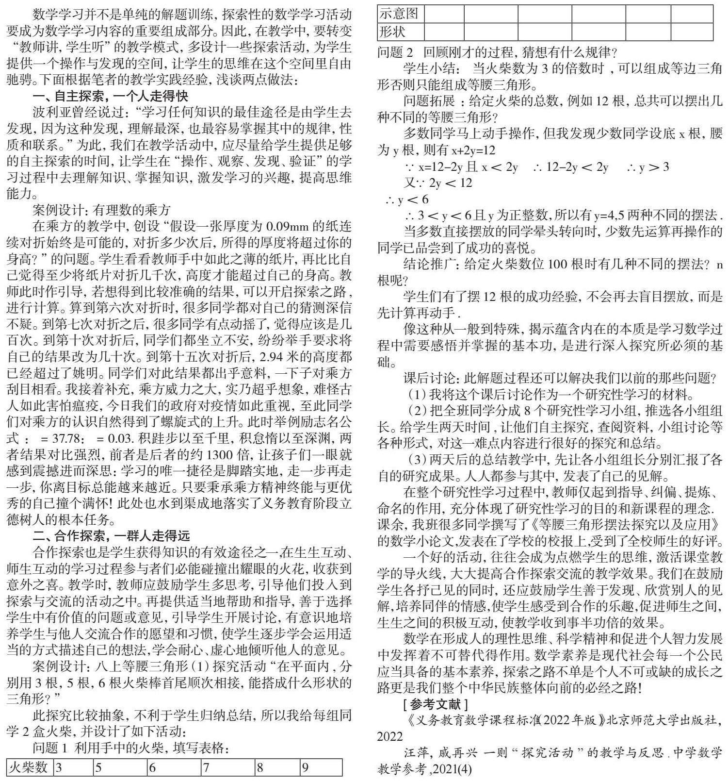 【内容提要】《数学课程标准(2022年版)》指出:“学生的学习应是一个主动的过程,认真听讲、独立思考、动手实践、自主探索、合作交流等都是学习数学的重要方式。”所以在教学中,要给学生多创造自主探索、合作交流、积极思考的机会,使他们在学习的过程中真正理解和掌握基本的数学知识、技能、思想,同时获得广泛的数学活动经验。