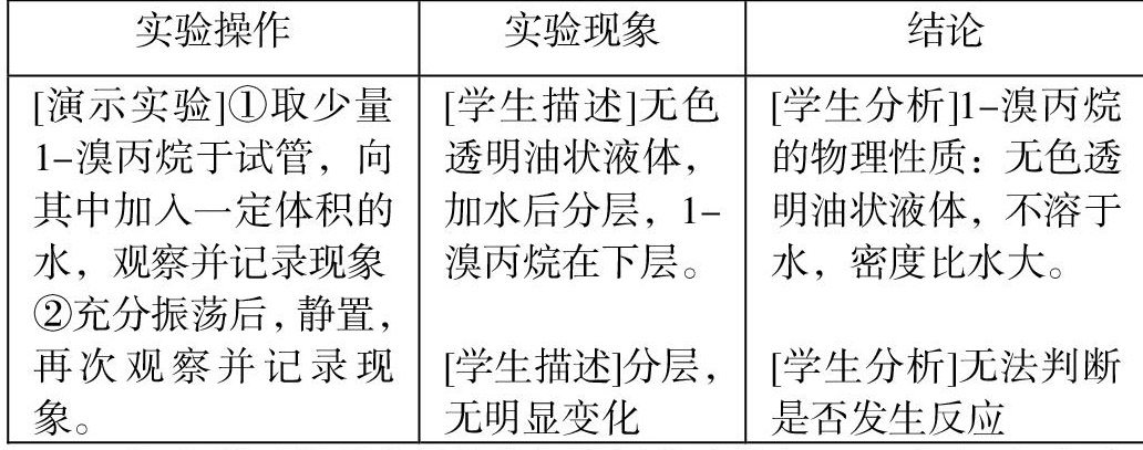设计意图:结合文献具体认识1-溴丙烷,通过与水、无水乙醇的对比实验,学生亲自感知了1-溴丙烷作为工业清洗剂所具备的快速油污溶解能力。因为该物质可能潜在的毒性,所以学生在进行实验需要有一定的风险意识,并做好防护工作。整个环节的设置,逐步实现了从生活走向生产的初探过程。