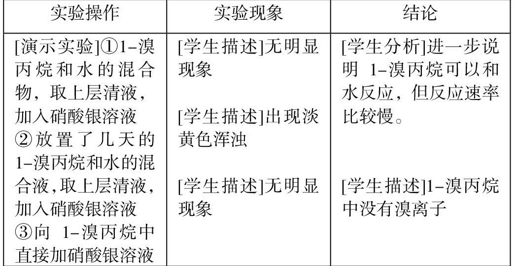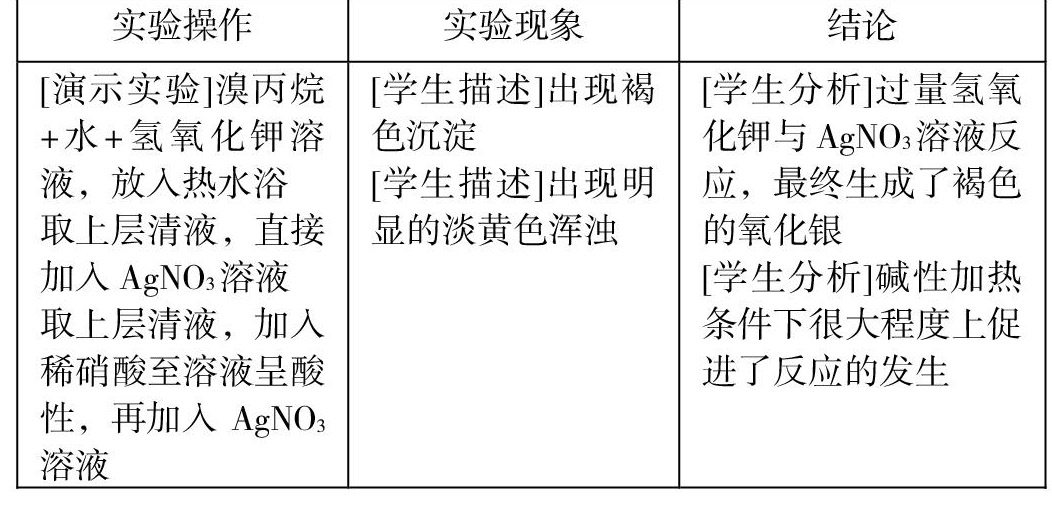 对卤代烃的水解反应的实验在课本基础上进行了充实,采用对比分析法,直观地展示卤代烃与水混合可以发生缓慢的反应。再结合物质结构的知识,引导学生自主总结促进反应发生的条件,最后通过实验进一步验证。对于消去反应的理解,沿用了上述探究的思路。