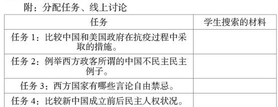 设置的意图:在议题的指引下,培养核心素养(政治认同、科学精神、公共参与):任务1和任务3:例举比较中美抗疫中的表现,看出西方的所谓民主带有欺骗性;任务2:不能以民主发展的程度来否定我国民主的优越性;