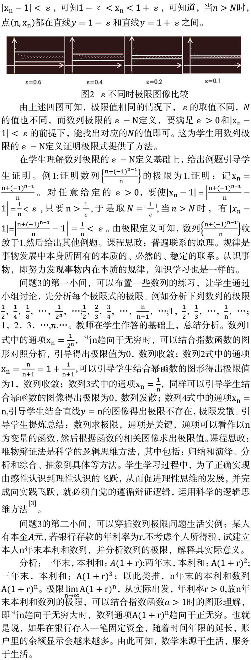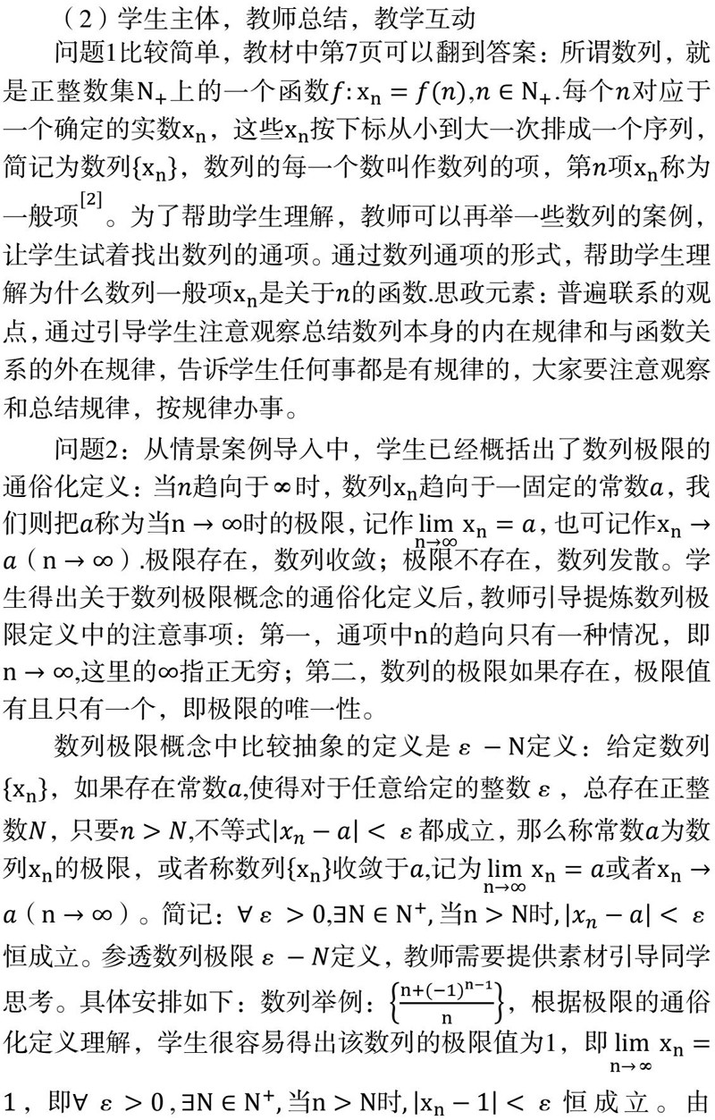 近年来,课程思政与课程教学相融合已上升为国家战略。《高等学校课程思政建设指导纲要》明确了理学类课程思政建设的重点,即要在课程教学中把马克思主义立场观点方法的教育与科学精神的培养结合起来,提高学生正确认识问题、分析问题和解决问题的能力。实现新的课程教学目标,既要发挥教师的指导作用,又要发挥教师在教学过程中促使学生积极主动学习的载体作用。如何在数列极限教学中恰当的融入思政元素,使学生在自然理解掌握所学知识的同时,融思政之“盐”于数列极限之“汤”中,引起学生情感的共鸣,是当前每一位数学任课教师应该考虑的现实问题。