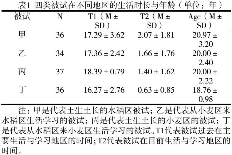 被试群体与研究一为同一批被试。水稻区选择福建省作为代表,小麦区选择山东省为代表,从两省份共收集被试150人。其中土生土长于水稻区的被试37名,有效数据为34份,有效数据比为92%;从小麦区来水稻区生活学习的被试37名,有效数据36份,有效数据比为97%;土生土长于小麦区的被试38名,有效数据34份,有效数据比为89%;从水稻区来小麦区生活学习的被试38名,有效数据38份,有效数据比为100%。所有被试均是自愿参与该实验,均以汉语为母语,视力与矫正视力正常。