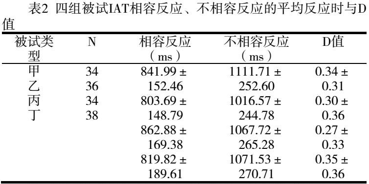 结果处理:上述每一反应的反应时及对错情况均由计算机自动记录。参考Greenwald计算内隐效应量的D值法,删去错误率高的反应时,分别计算四组被试在相容任务组和不相容任务组中的平均反应时,最后对四组被试相容任务组和不相容任务组中的平均反应时进行均值比较[15][16]。