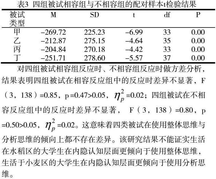 对四组被试相容组反应时、不相容组反应时做方差分析,结果表明四组被试在相容反应组中的反应时差异不显著,F(3,138)=0.85,p =0.47>0.05,=0.02;四组被试在不相容反应组中的反应时差异不显著, F(3,138)=0.80,p =0.50>0.05,=0.02。这意味着四类被试在使用整体思维与分析思维的倾向上都不存在差异。该研究结果不能证实生活在水稻区的大学生在内隐认知层面更倾向于使用整体思维,生活于小麦区的大学生在内隐认知层面更倾向于使用分析思维。