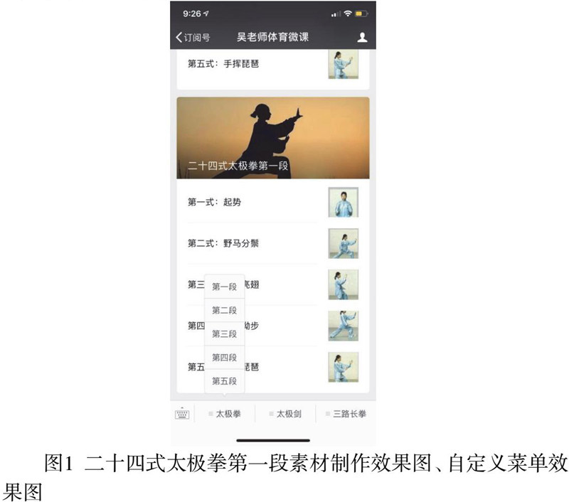一个图文素材可以最多链接8篇文章,点击“+”即可添加,每篇文章里面还可以编辑若干文字讲解、图文、动画和短视频,足以把教学内容讲好讲透,图文并茂,各种短小精干的微课呈现在学生面前。以24式太极拳第一段教学为例,笔者做了一个第一段的总体微课,然后结合第一段的每个动作,通过3D动画进行精讲,有一个比较好的层次感,在菜单点击之后的效果图见图1。