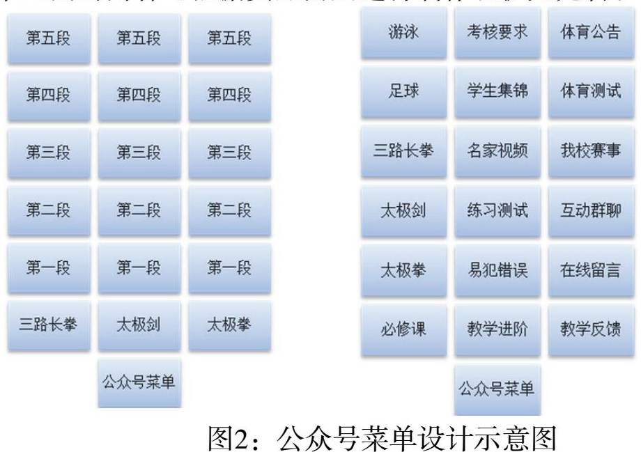 自定义菜单是公众号的主体结构,围绕这个框架展开,微信公众号总共提供3个横向大菜单,每个大菜单可以上拉,出现5个小菜单,整个布局比较简单,但是比较实用,每个小菜单内容仍然可以扩充,基本满足教学需要。以“吴老师体育微课”公众号为例,将所任课的三门课程太极拳、太极剑和三路长拳制作成横向菜单,然后再将太极拳分为5段来讲解,用上5个小上拉菜单,见图1。将之前制作的第一段素材链接到第一段小菜单上,读者点击第一段菜单,就随时可以看到老师制作的微课视频。以此类推,第2段到第5段,每段可推送5到6个动作,可将24式太极拳内容很好的呈现给学生。体育老师亦可根据自身授课情况进行调整,例如图2的模式来构建,在3个横向菜单中设置必修课、教学进阶和教学反馈3项,在必修课又中设置5个子菜单:太极拳、太极剑、三路长拳、足球和游泳,在教学进阶则设置易犯错误、练习测试、名家视频、学生集锦和考核要求5个上拉菜单,每个子菜单里面的内容可根据实际需要进行制作和扩充完善。
