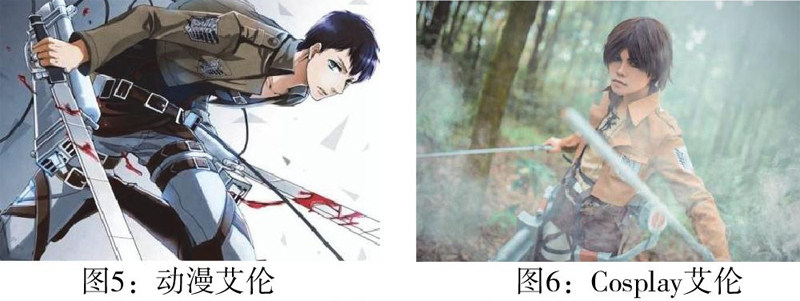 虚拟模仿型服装注重服装的艺术表现,而忽略了服装的实用性。"cosplay”服饰可以算是典型。在造型方面,要讲究内、外造型结合。外造型指服饰的轮廓感和人物服饰的还原度,而内造型则是我们常说的省道、结构线等。在色彩搭配方面,设计这类服装要考虑人物本身的时代背景或角色定位。在材质选择方面,充分利用面料性能,可以使“cosplay”服饰展现出更好的效果。在满足以上三要素的虚拟模仿型服饰,才能跟深入“次元宅”的内心,使其成为一种寄托,如图5、6动漫《进击的巨人》服饰的呈现效果。