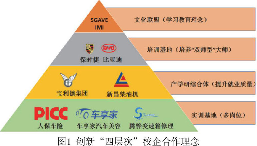 在总结保时捷PEAP项目成功经验的基础上,为解答“引进什么企业、合作什么内容、发挥什么作用”等三大问题,创立“四层次”校企合作理念,如图图1所示。第一层次是参与国际汽车职业教育联盟合作(中德SGAVE、中英IMI),组建文化交流联盟。吸收借鉴国际企业文化,推动专业的教学改革和教育理念革新;第二层次是与汽车制造企业(保时捷中国、比亚迪新能源)共建培训中心。实现教学过程与生产过程对接、教学标准与企业标准融合,提升企业员工技能水平,同时培养高职“双师型”教师;第三层次是与本地大型集团(浙江宝利德、新昌柴油)、行业学会(中国汽车工程学会)联盟合作,建设产学研综合体,提升教师技术服务能力,以及提高学生就业质量,实现就业品牌高端化和就业实习一体化;第四层次是与周边经销商(中国人保车险、腾骅自动变速器、车享家汽车美容)多方位合作,共建校外实训基地,形成学习双场地,作为“准员工”的订单班学生可以进行企业技能提升与学校理论充实相结合。