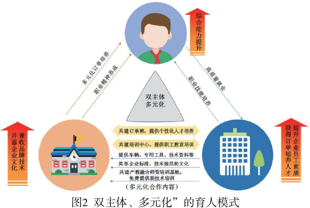 依托保时捷品质实习生、比亚迪新能源汽车精诚英才等校企合作项目,引进国际先进的职业教育资源,实施“双主体(企业和学校)”管理和“多元化(多元合作内容和多元合作岗位)”培养,如图2所示。