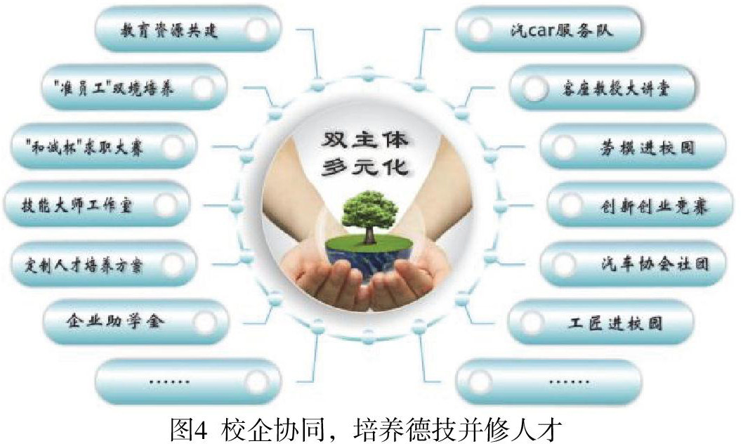 通过“四层次”深度合作,实现学校与国际汽车职教联盟、汽车制造商、汽车集团、汽车经销商协同育人的目的。新理念阐释了校企合作与开放办学之间的关系,解决了校企间“文化、技术、人力资源”三融合的问题。