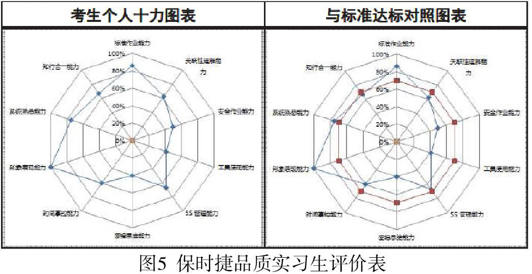 试点实践中引入保时捷全球认证评价体系,见图5所示。从进入项目之日起至毕业,记录学生的整个学习过程,并通过及时有效地干预和指导,提升项目学员各方面的能力,并确保保时捷项目实习生的流失率最低。保时捷全球认证评价体系采用“三大结构、五大领域、十大技能”的认证模型,该模型反映学生的职业素养、个人综合潜力、项目的忠诚度、职业技能等,针对薄弱环节提出建议,帮助学员更好地掌握知识,全面提升实习生的综合素养。