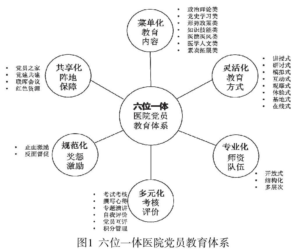 具体推进时应把握好三条原则:一是突出根本遵循。构建医院党员教育体系要以《中国共产党章程》《党员教育管理工作条例》《2019-2023年全国党员教育培训工作规划》等为根本指南,以社会主义核心价值观为根本主线,把学习贯彻习近平新时代中国特色社会主义思想作为首要政治任务,从理论和实践两个方面入手,规范、系统地展开对党员的教育。二是突出行业特色。构建医院党员教育体系要以“1+2”文件为基准,要充分体现医院行业特点,符合医院党员工作实际,洞悉党员思想动向,契合党员基本需求。三是紧跟时代发展。构建医院党员教育体系要正视信息化环境下的全新意识形态给医院党员教育工作创新及严肃性带来的机遇和挑战,创新教育理论、内容、方法、力量、工作运行和制度机制,引导广大党员吸纳、学习并认同教育的内容。从调研访谈情况来看,可以通过构建一套教育内容菜单化、方式灵活化、队伍专业化、评价多元化、激励规范化、阵地共享化相融合的六位一体的新时代医院党员教育体系(见图1)。