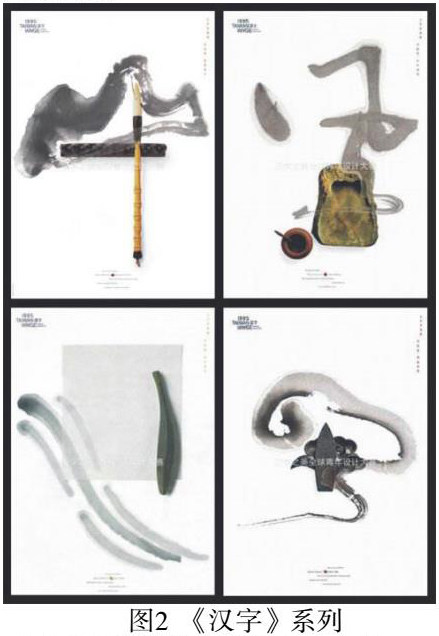 文化依附着自然,文化又重塑着自然。《汉字》系列(图2):这一系列的海报设计是靳埭强先生的代表之作,作者很好的应用了中国画艺术中强调自然、不拘形式、讲究写意的特点,把中国画元素的笔触的流动性、灵性与墨色的层次浓淡发挥得淋漓尽致,饱含浓情,达到使人看到作品如身临其境、天人合一的境界。同时中国画元素在视觉传达设计中的应用还使图形的传播更鲜明、更快捷、更直接。